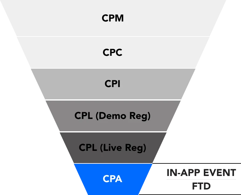 Тази програма е предназначена за рекламни агенции с изключителни техники за дигитален маркетинг, които се заплащат на база на стойност за действие (CPA). Рекламните агенции с валидна AppsFlyer Agency Account могат да приложат своята стратегия за дигитален маркетинг, за да постигнат определено действие (депозит в приложението) и да получават плащане за всяко извършено действие.